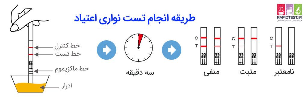 “نتیجه مثبت به این گونه می باشد که یک خط در ناحیه نوار تست ظاهر شود و هیچ خط دیگه نمایان نشود نتیجه تست مثبت ((+)) می باشد”